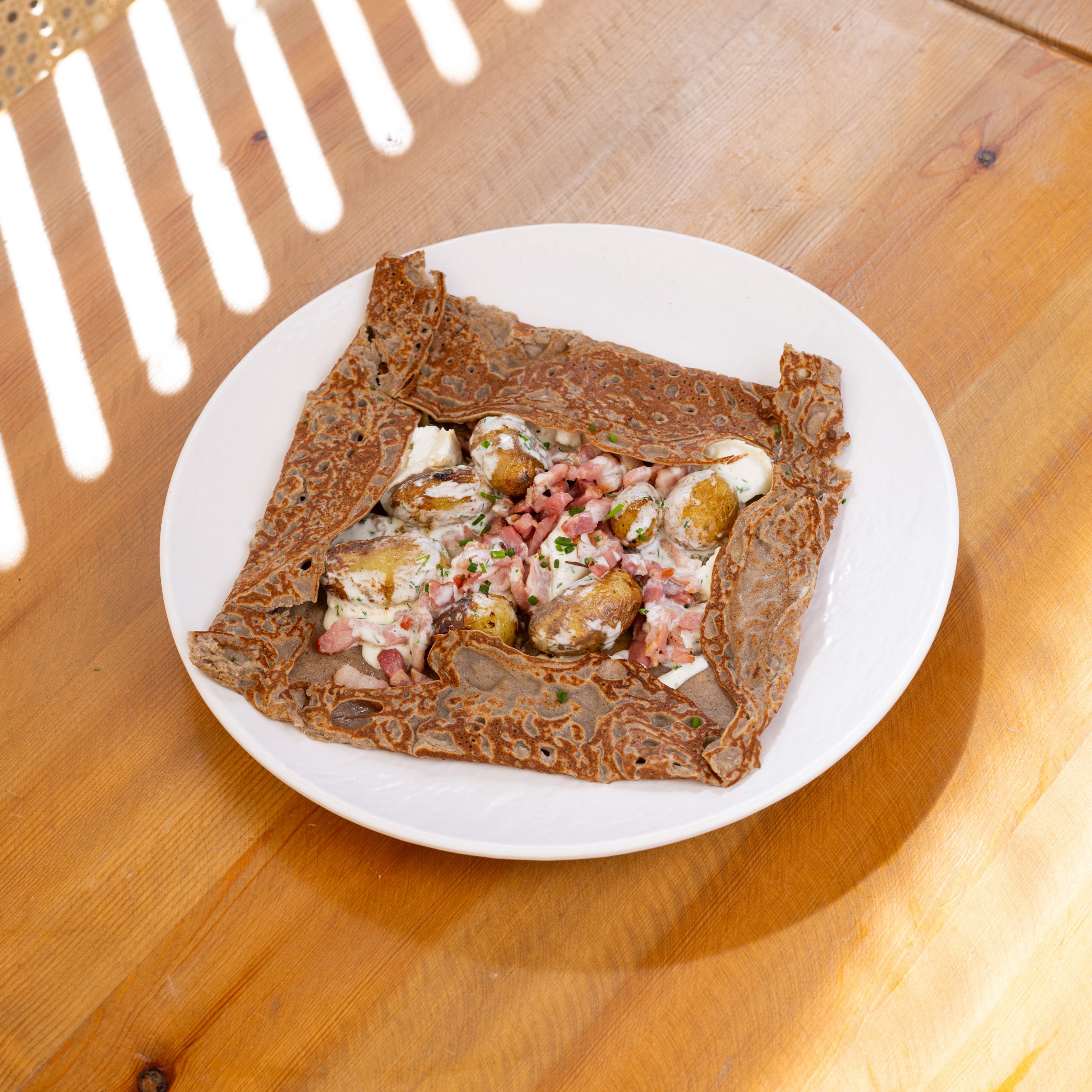 Fromage de chèvre, lardons fumés, pomme de terre grenaile, compotée d’oignons maison, crème fraîche