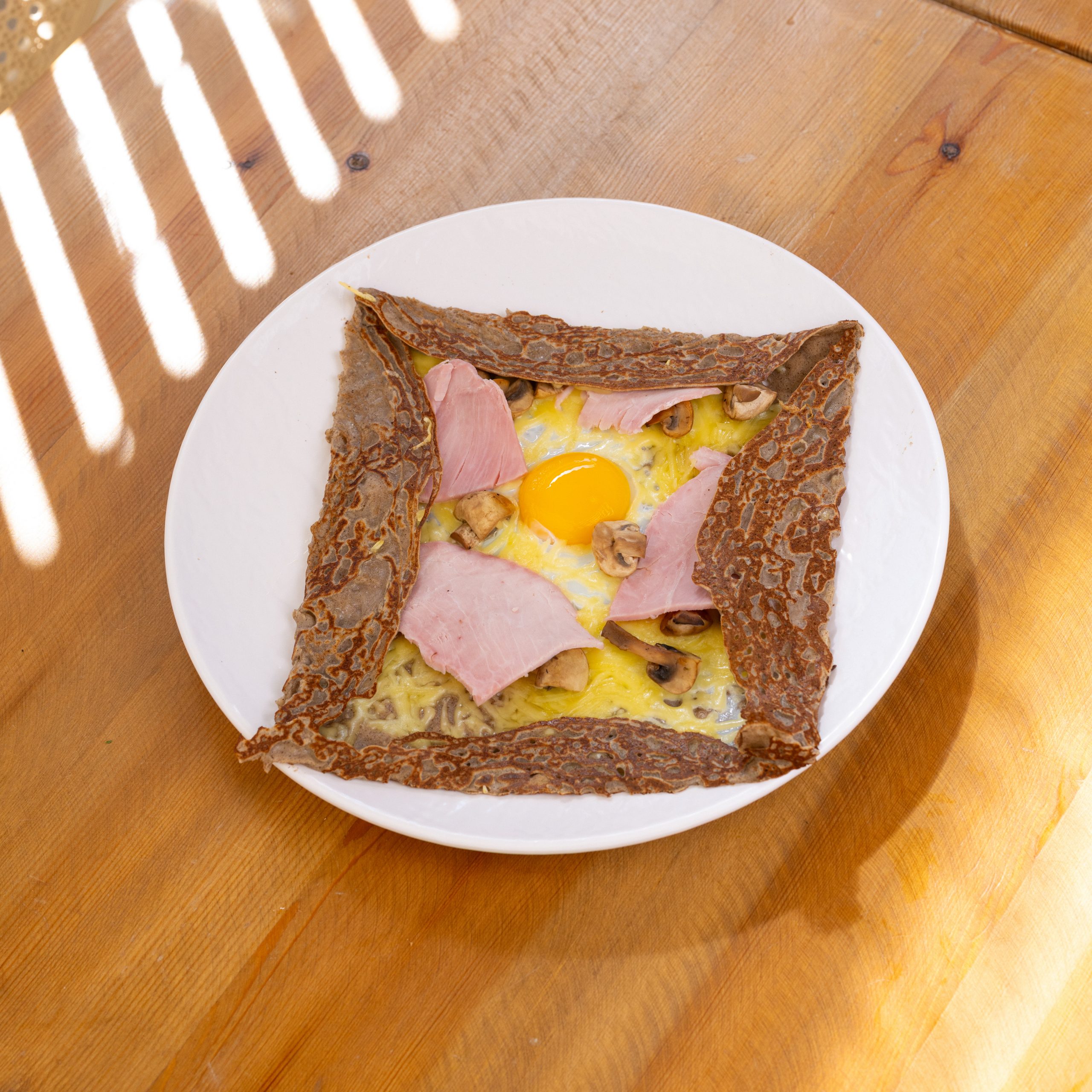Jambon blanc, oeuf, emmental, champignons cuisinés