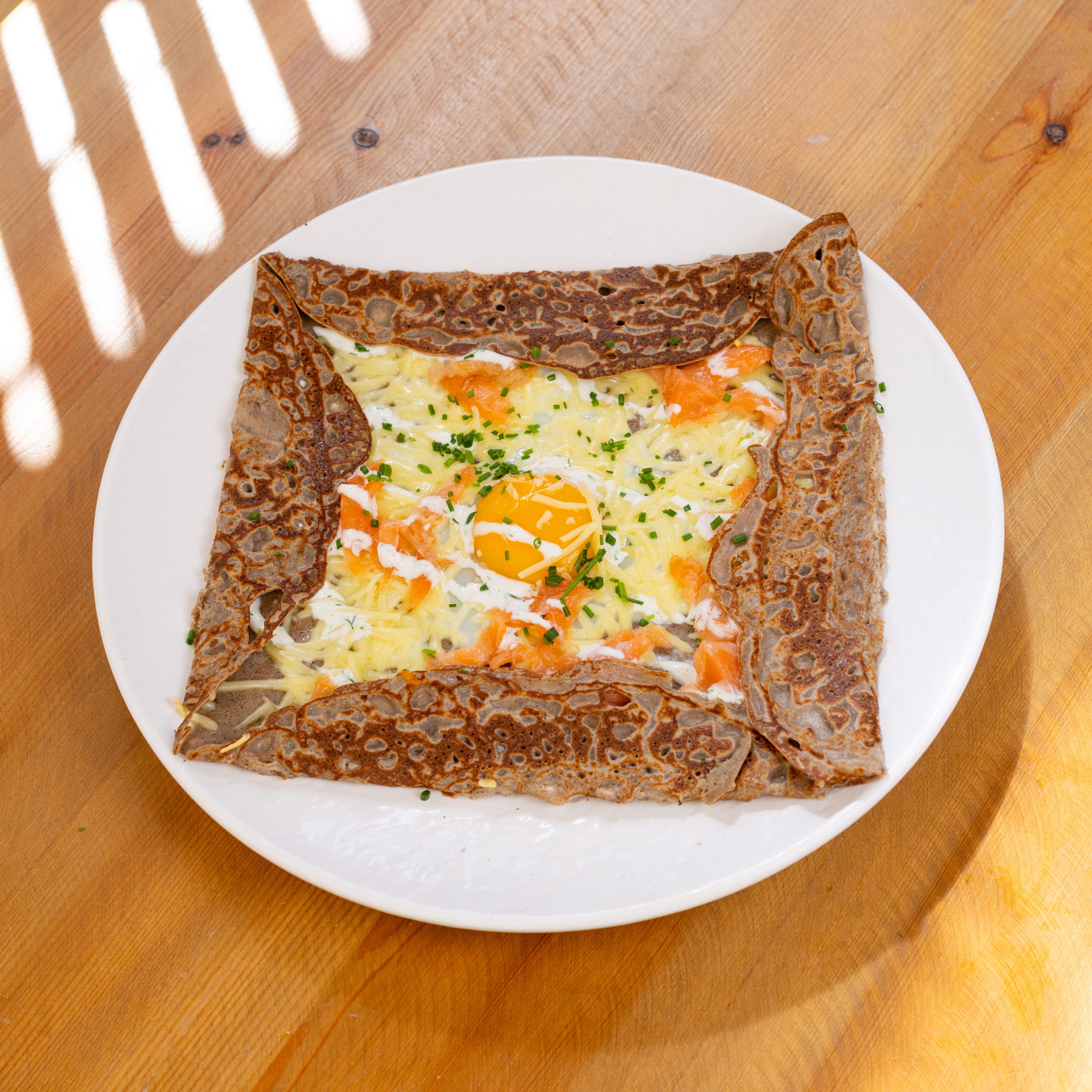 Saumon fumé maison, crème citronnée à l’aneth, oeuf, emmental