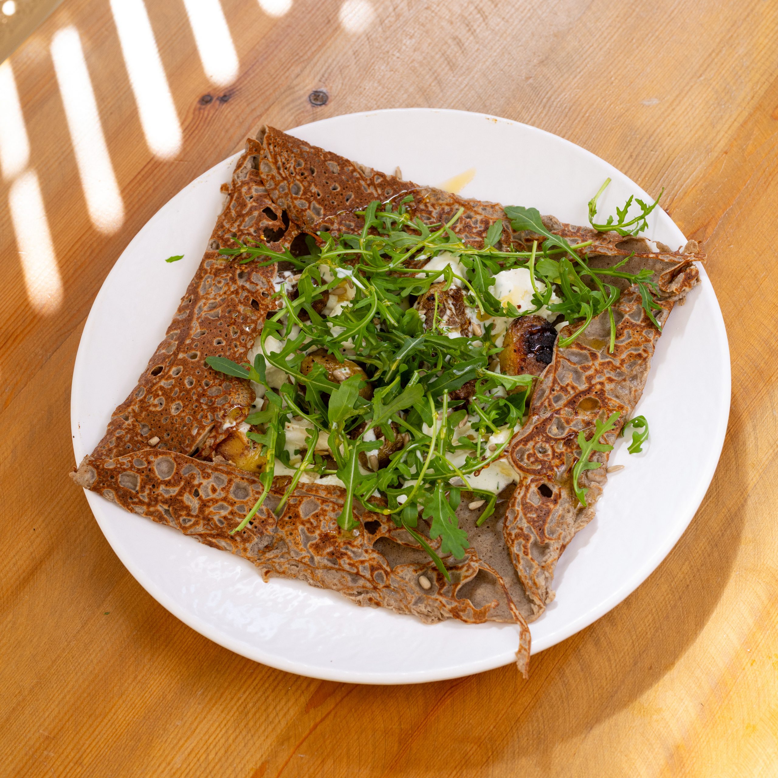 Fromage de chèvre, miel, noix, pommes de terre grenaille, roquette, crème de mascarpone